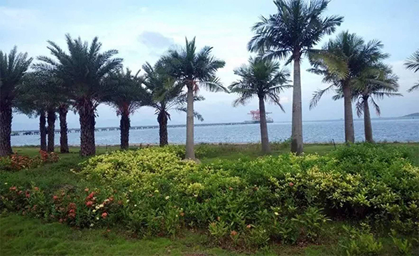 該項目總綠化面積67.7萬平方米,其中石化區(qū)北側(cè)防護林帶西起沿海高速公路石化區(qū)出口,東至石化大道,北側(cè)為沿海高速公路,南側(cè)為北環(huán)路的狹長地帶綠化隔離帶,自西向東全長約為9188米,綠化總面積約為52.5萬平方米。石化區(qū)東側(cè)防護林帶西接北側(cè)防護林帶,東至石化大道路口,分布于北環(huán)路兩側(cè),綠化總面積約為11.6萬平方米。中海油倒班宿舍綠化面積約3.6萬平方米。東、北側(cè)防護林帶工程設(shè)計共有苗木約75242株,地被植物約41408平方米??偼顿Y約為1800萬元,于2013年3月開工,2014年12月竣工驗收。