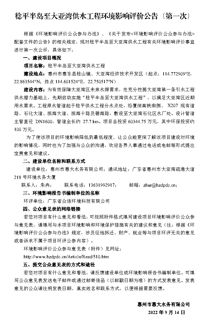 稔平半島至大亞灣供水工程環(huán)境影響評(píng)價(jià)公告(第一次)
