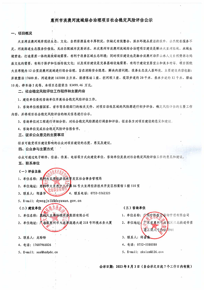 惠州市淡澳河流域綜合治理項(xiàng)目社會(huì)穩(wěn)定風(fēng)險(xiǎn)評(píng)估公示
