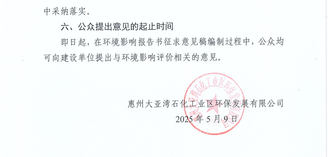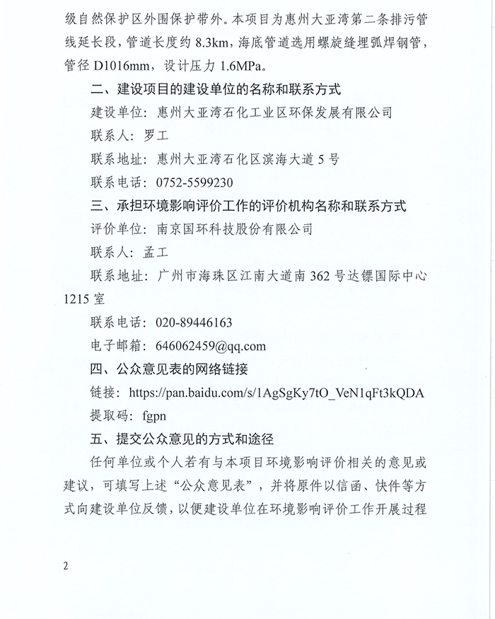 惠州大亞灣石化區(qū)第二條污水排海管線延長段項目環(huán)境影響評價第一次公示